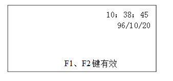 密碼正確后顯示如上面菜單,密碼錯(cuò)誤則返回封面菜單。 其中小時(shí)處(即數(shù)字“10”反顯,用“F1”鍵進(jìn)行切換,依次反顯時(shí)、分、秒、年、月、日,用“F2”鍵進(jìn)行反顯處時(shí)間修改,每按一次“F2”鍵,反顯處數(shù)字增一。
